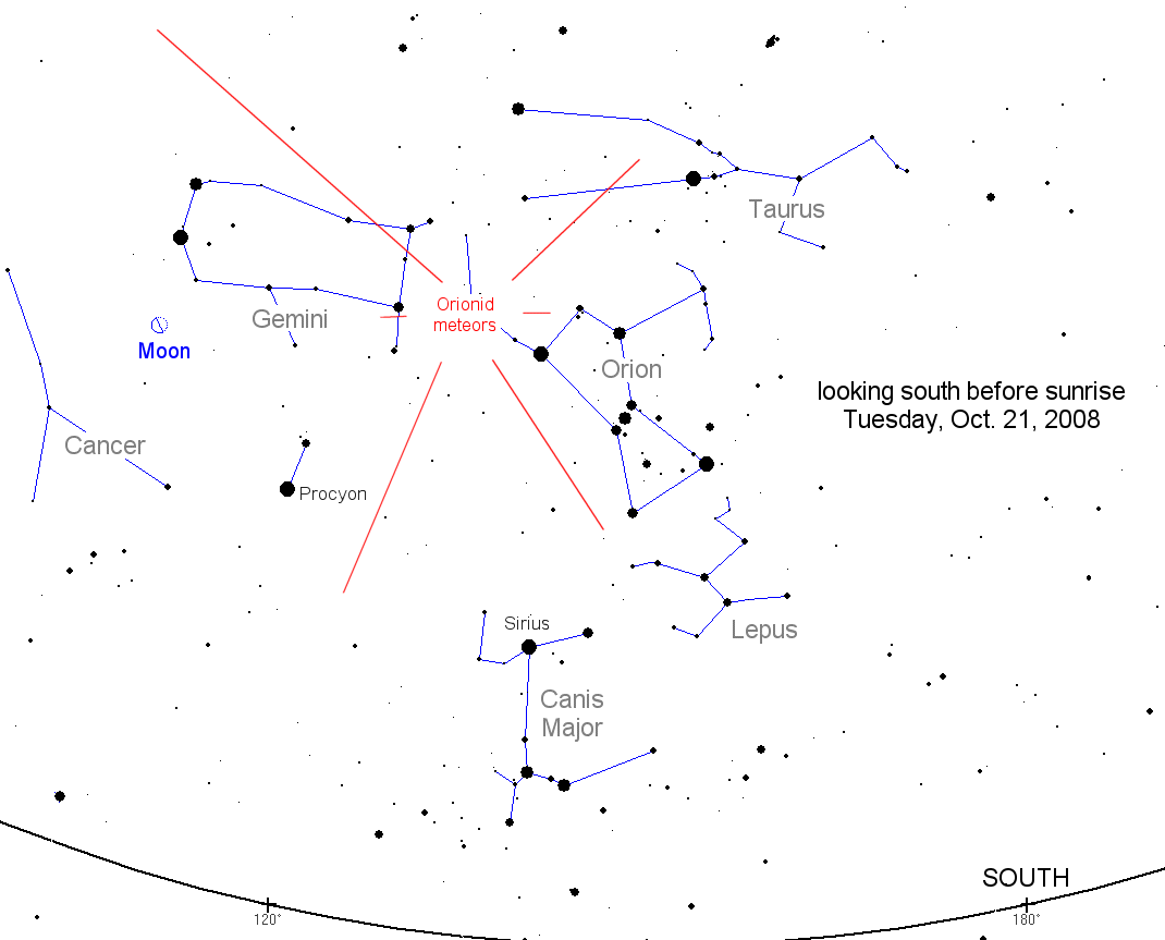 Il sito di spaceweather.com allerta gli osservatori di meteore per questa notte e domani. Chi avesse l'occasione di svegliarsi prima dell'alba potrebbe avere 15-20 minuti buoni per osservare in direzione di ORIONE lo sciame delle (appunto) orionidi. Questo sciame è originato dalle polveri residue sull'orbita della cometa di Halley e il massimo di attività è previsto proprio in questi giorni. Le aspettative non erano delle migliori a causa dell'interferenza dovuta alla presenza della Luna, tuttavia sono giunte segnalazioni inaspettate da osservatori che sono riusciti a rilevare fino a 15 meteore per ora molte delle quali con magnitudine superiore a stelle di prima magnitudine. Nel caso in cui si confermasse questo andamento anche domattina, potrebbe valere la pena svegliarsi un pò in anticipo per gustare qualche meteora interessante !Troverete ulteriori info sul sito di spaceweather.com oltre alla mappa del cielo.