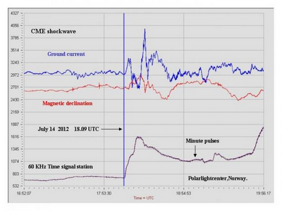 Tempesta geomagnetica (15-07-2012 16:00): Una forte tempesta geomagnetica è in corso in quanto il campo magnetico terrestre sta riverberando la CME che ha impattato il 14 luglio. In un primo momento l'impatto del CME sembrava relativamente debole, ma le condizioni sulla scia del CME si sono incrementate rapidamente trasformandosi in vera tempesta. Gli analisti del laboratorio Goddard Space Weather affermano che i satelliti in orbita geostazionaria potrebbero essere stati direttamente esposti al plasma del vento solare. Non è però ancora dato sapere se possano averne subito conseguenze. Inoltre, "Northern Lights" sono apparse negli Stati Uniti fino al sud della California, Utah e Nebraska.