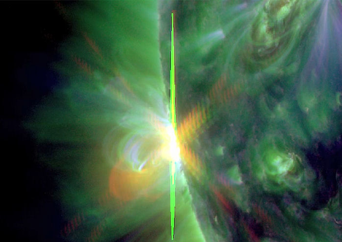 Il NASA Solar Dynamics Observatory ha registrato il flash nell'estremo ultravioletto (immagine), che ha inviato diverse onde di ionizzazione che hanno attraversato l'atmosfera superiore della Terra.